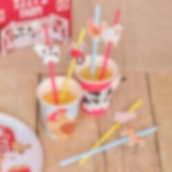 16 stk. papsugerør i flotte farver og med motiver af søde små bondegårdsdyr og en traktor ovenpå. Sugerørene er 19 cm lange.