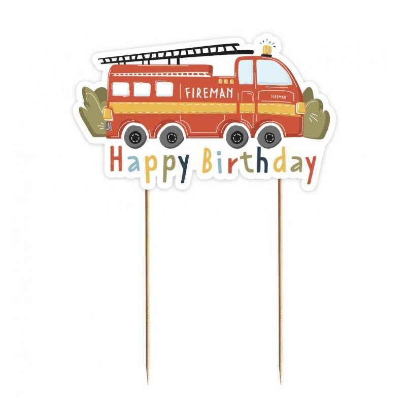 Cake Topper med motiv af en brandbil og teksten "Happy Birthday" i muntre farver. Højde 19 cm.