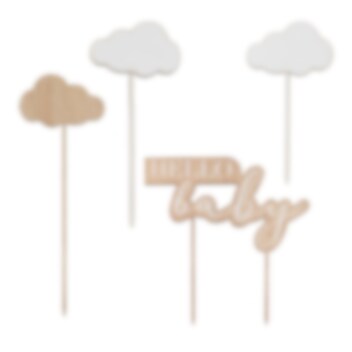 4 stk. cake toppers i træ med forskellige søde Hello Baby motiver. Perfekt til at pynte kagen med, når det er tid til babyshower-fest. De er mellem 6 og 12 cm høje.