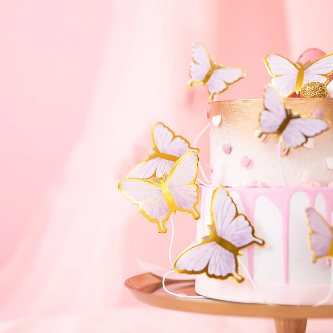 10 stk. smukke kagedekorationer i form af lilla sommerfugle med elegante guldfolierede detaljer. Sættet inkluderer også 10 fleksible tynde pinde og 10 limprikker, så du nemt kan fastgøre og arrangere sommerfuglene på din kage. Størrelsen på sommerfuglene er fra 5 til 9 cm.