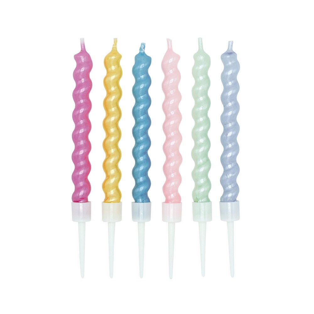 De fine pastelfarver og den blanke overflade gør lysene til et smukt blikfang på fødselsdagskagen. Hvert bogstav sidder på en praktisk holder, der gør dem nemme at placere i kagen, cupcakes eller andre bagværk, når det er tid til at fejre.
