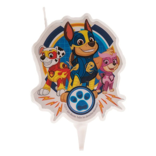 Flot kagelys med motiver af hundene fra Paw Patrol til at pynte fødselsdagskagen med. Lyset er omkring 7,5 cm højt og 5,5 cm bredt.