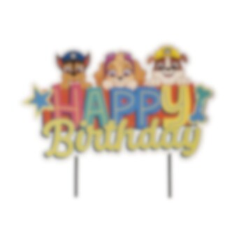 Cake Topper af pap med teksten "Happy Birthday" og mange sjove motiver fra Paw Patrol! Højde ca. 14,5 cm.