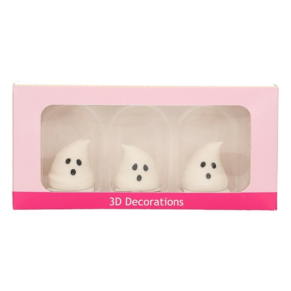 3 stk. sukker dekorationer, der repræsenterer små søde 3D-spøgelser. Perfekt til at dekorere tærten eller cupcakes med, når det er tid til en fest eller fest.