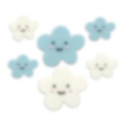 6 stk. sukkerdekorationer som forestiller små søde små skyer i farverne blå og hvid. Herligt at dekorere kagen med før festen.