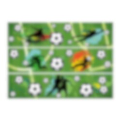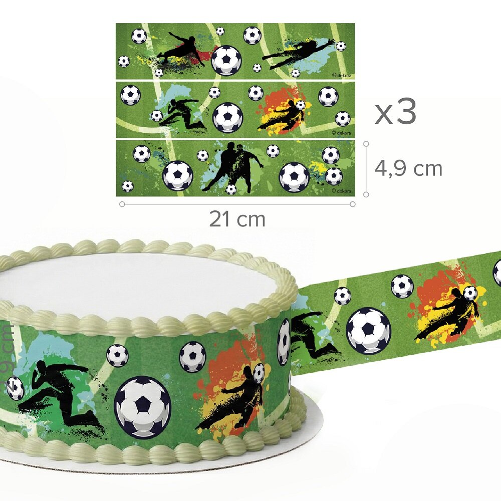 Skab en rigtig sportslig fødselsdagskage med dette kagedekorationsband i fodboldtema! Med de grønne baggrunde, fodboldene og spillersilhuetterne bliver det nemt at dekorere kagens kant og give kagen en tydelig fodboldsstemning.
