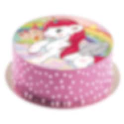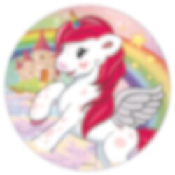 Smukt kageprint af en god sukkerfri sukkerpasta med et sødt enhjørningsmotiv. Kageprintet er klar til at blive lagt direkte på kagen og har et skarpere og mere detaljeret tryk end et oblatprint har. Printet er ca. 16 cm i diameter.