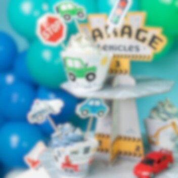 Skab en sjov stemning med dette muffinstativ, der forestiller en garage til alle slags køretøjer. Det passer perfekt til en fødselsdag med køretøjstema og er fremstillet af stabilt pap med en størrelse på 46 x 34 cm.