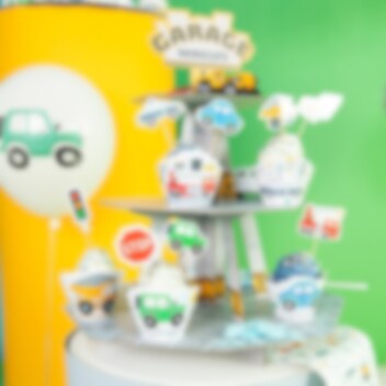 Skab en sjov stemning med dette muffinstativ, der forestiller en garage til alle slags køretøjer. Det passer perfekt til en fødselsdag med køretøjstema og er fremstillet af stabilt pap med en størrelse på 46 x 34 cm.