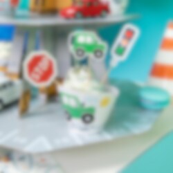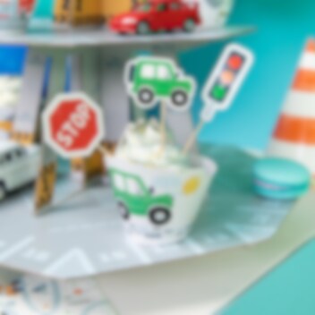 8 stk. cake toppers med forskellige farverige køretøjer, trafiklys og vejskilte. Perfekt til at dekorere kager og bagværk med til børnefødselsdage med køretøjstema! De er cirka 9 cm høje og er lavet af pap og træ.