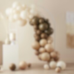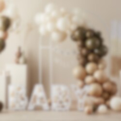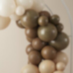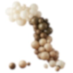 Luksuriøs ballonbue i brune og neutrale toner, som du selv bygger. En virkelig imponerende dekoration, der egner sig til både fester, sammenkomster eller babyshows. Pakken indeholder hele 70 stk. balloner i forskellige størrelser og tilbehør. Ballonbuen er omkring 5 meter lang.