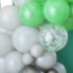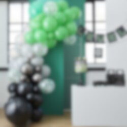 Lækker ballonbue i sorte, grønne og grå toner, som du selv bygger. En rigtig fed dekoration, der passer til både fest og fejring. Pakken indeholder hele 70 stk. balloner i forskellige størrelser og tilbehør. Ballonbuen er omkring 5 meter lang.