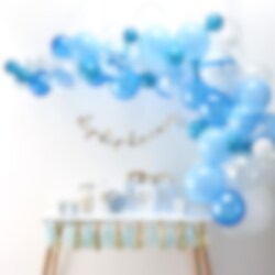 Elegant ballonbue i blå og hvide farver, som du selv kan sammensætte derhjemme. Den perfekte dekoration til enhver festlig lejlighed. Pakken inkluderer 70 stk. balloner samt en vejledning på engelsk, der viser hvordan du sammensætter ballonbuen. Ballonbuen bliver ca. 4 meter stor.