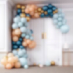 Flot ballonbue i blågrønne, fersken- og guldkromfarvede toner, som du selv bygger. En virkelig imponerende dekoration, der er velegnet til både fester, fødselsdage eller bryllupper. Pakken indeholder hele 200 stk. balloner i forskellige størrelser og tilbehør. Ballonbuen er cirka 12 meter lang.