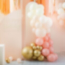 Imponerende ballonbue i fersken- og guldtoner, som du selv bygger. En ægte luksuriøs dekoration, der er velegnet til både fester, fødselsdag eller bryllupper. Pakken indeholder hele 75 stk. balloner i forskellige størrelser og tilbehør. Ballonbuen er cirka 4 meter lang.