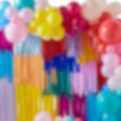 Smuk DIY-ballonbue i alle regnbuens farver med tilhørende streamers. Den ultimative dekoration, der garanteret imponerer gæsterne. Sættet inkluderer: