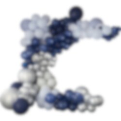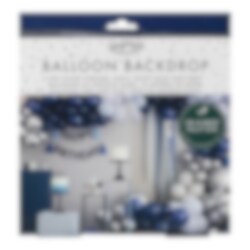Mægtig ballonbue i sølv, blå og mørkeblå, som du selv bygger. En virkelig imponerende dekoration, der egner sig til både fester, sammenkomster eller bryllupper. Pakken indeholder hele 200 stk. balloner i forskellige størrelser og tilbehør. Ballonbuen er omkring 12 meter lang.
