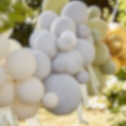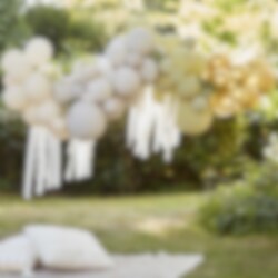 Smuk ballonbue i grønne og gyldne toner med tilhørende dekorative palmeblade, som du selv samler. En virkelig imponerende dekoration, der er velegnet til fester, fester eller baby shower. Pakken indeholder 70 balloner i forskellige størrelser og tilbehør. Ballonbuen er ca. 4 meter lang. Inkluderer: