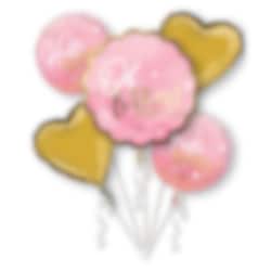 Vidunderlig ballonbuket i farverne lyserød, guldfolie og hvid. En sød dekoration til babyshoweret. Ballonbuketten indeholder 5 balloner, heraf 2 stk. hjerteformede guldfolieballoner (43 cm), 2 stk. runde lyserøde balloner med teksten "Hello World!" i hvid- og guldfolie (43 cm) og en blomsterformet folieballon med guldfolierede kanter og teksten "Oh Baby!" i hvid- og guldfolie på en lyserød baggrund (55 cm).