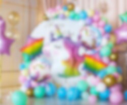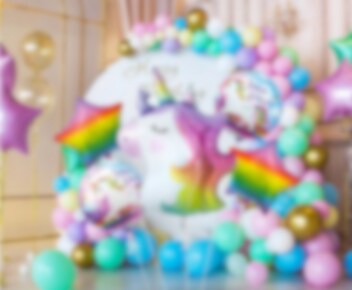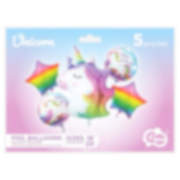 Sød ballonbuket med forskellige folieballoner i enhjørninge-tema. Buketten består af en stor enhjørningeballon, to runde balloner med enhjørningemotiver, 35 cm, og to stjerneformede balloner i regnbuefarver, 35 cm. Ud over balloner medfølger der hvid ballonstreng.