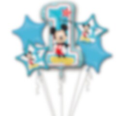 Sød ballonbuket med Mickey Mouse med 1-års motiv. Flot at have som dekoration til 1-årsfesten. Pakken indeholder en ballon formet som et 1-tal (ca. 48 x 71 cm) og 4 stjerneformede folieballoner (ca. 48 cm).