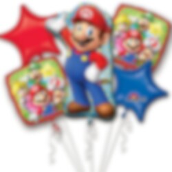Sej ballonbuket i temaet Super Mario. Dekorer rummet med denne og skab en hyggelig atmosfære. Pakken indeholder 5 stk. balloner. 1 stk. Super-shaped ballon formet formet ligesom Mario (55 x 83 cm), 2 stk. balloner formet som stjerner (48 cm) og 2 stk. firkantede balloner (43 cm). Kan pustes op med almindelig luft eller helium.