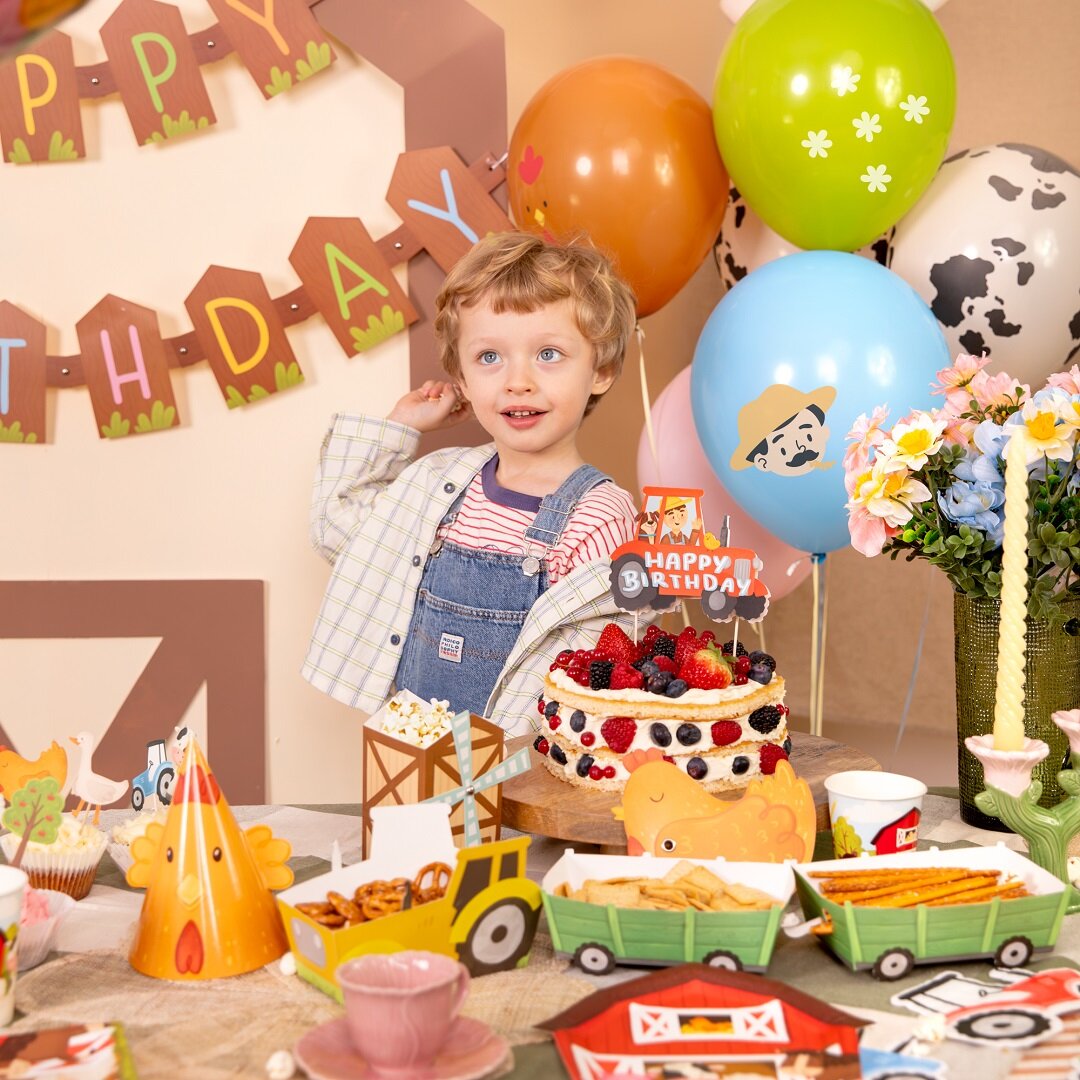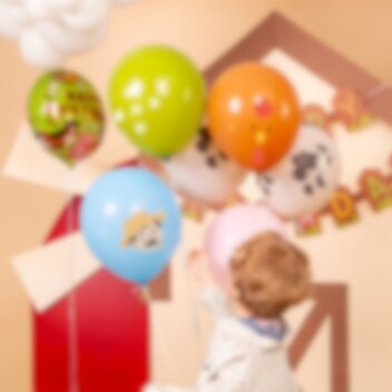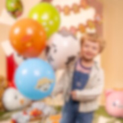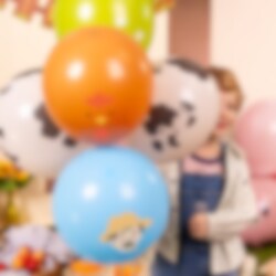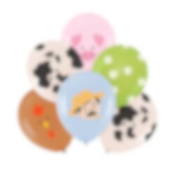 6 balloner i bondegårdstema, der bliver en sjov og farverig dekoration til børnefødselsdagen. Ballonerne har forskellige motiver som ko, gris, høne, blomster og bonde, hvilket passer perfekt til at skabe en festlig stemning til en fødselsdag med bondegårdstema.