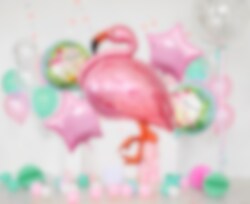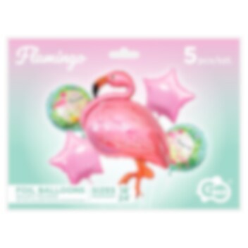 Smuk ballonbuket med forskellige folieballoner i Flamingo-tema. Buketten består af en stor Flamingo-ballon, 55 cm, to runde balloner med Flamingo-motiver, 35 cm, og to stjerneformede lyserøde balloner, 35 cm. Ud over balloner medfølger der hvid ballonstreng.