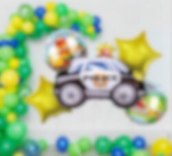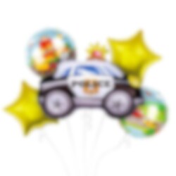 Sjov ballonbuket med forskellige folieballoner i politi-tema. Buketten består af en stor politibil, 70 cm, to runde balloner med køretøjsmotiver, 35 cm, og to stjerneformede balloner i guld, 35 cm.