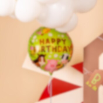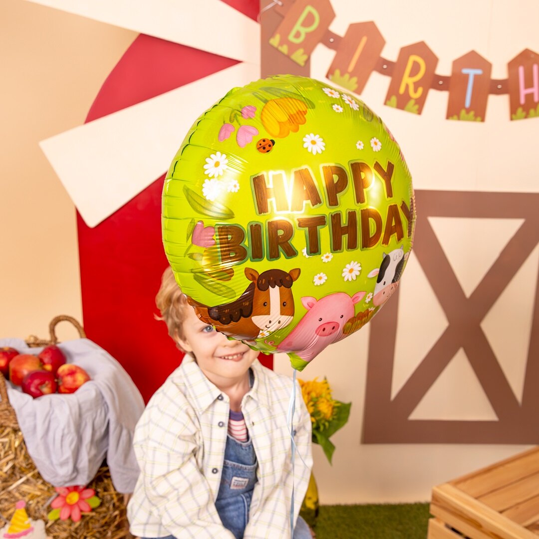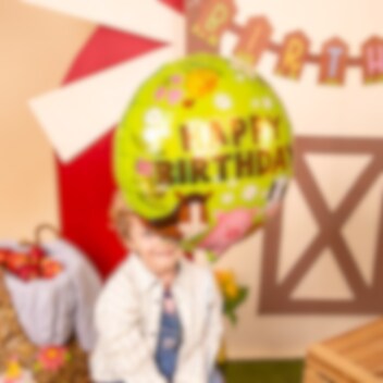 Skab en legende og festlig stemning til børnefødselsdagen med denne runde folieballon i bondegårdstema. Ballonen er prydet med hest, gris og ko sammen med blomster og teksten Happy Birthday, hvilket gør den til en fin dekoration til en fødselsdag med bondegårdstema.