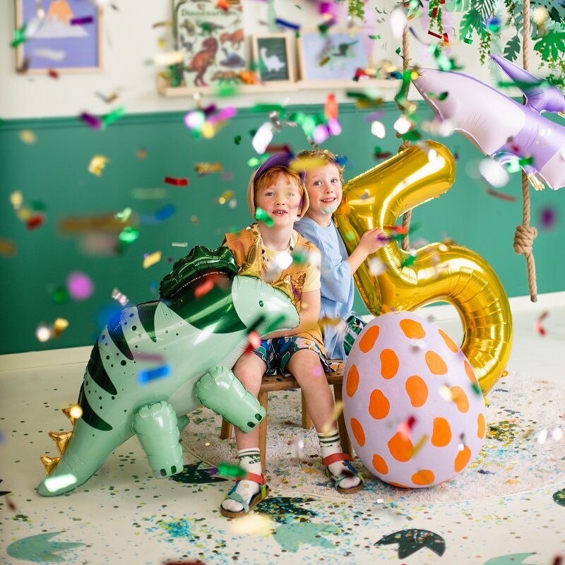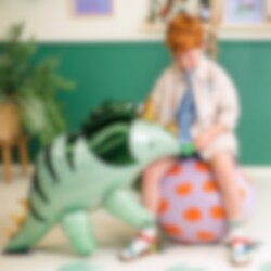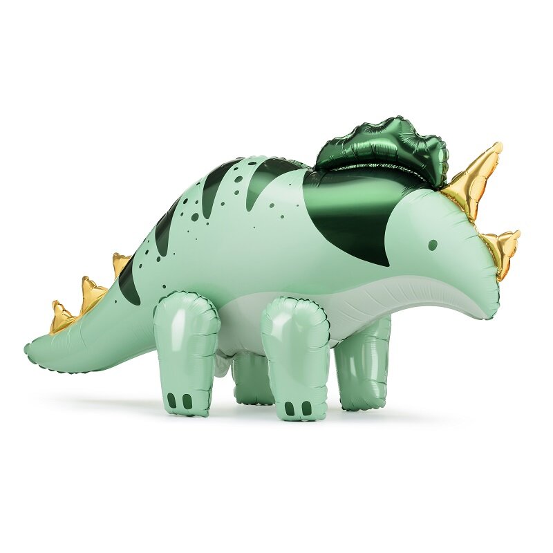 Folieballon forestillende en Tricatops i grønne farver med detaljer i guldfolie, der vil være en sjov dekoration til dinosaurfesten. Ballonen måler 101 x 60 cm når den er oppustet og kan pustes op med almindelig luft eller helium.
