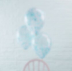 Fem luksuriøse gennemsigtige balloner fyldt med skinnende blåt folie indeni. Ballonerne kan oppustes med luft eller helium, og bliver omkring 30 cm i diameter oppustede.