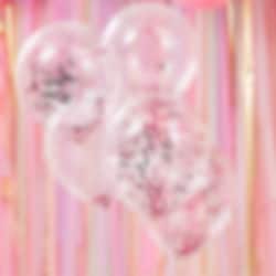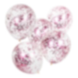 5 stk. gennemsigtige balloner fyldt med pink glitterkonfetti. Ballonerne kan oppustes med luft eller helium og er ca. 30 cm i diameter, oppustet.