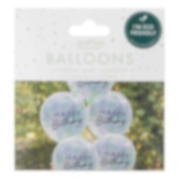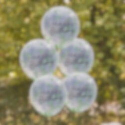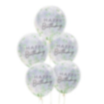 5 stk. latexballoner, der er gennemsigtige med teksten Happy Birthday og fyldt med konfetti med smukke grønne blade.