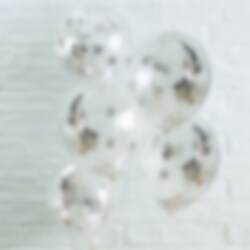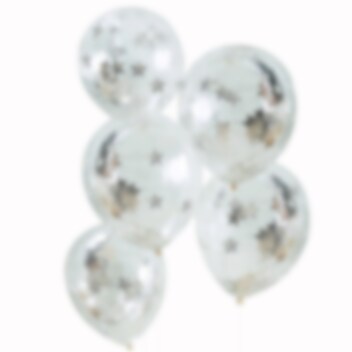 5 stk. dekorative balloner med skinnende stjerner af sølvfolie indeni. Ballonerne er transparente og lette at puste op. De bliver ca. 28 cm i diameter.