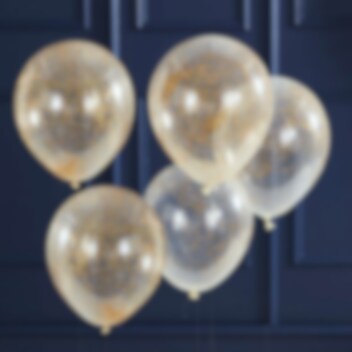 5 stk. transparente balloner, der er fyldt med guld, hårlignende konfetti fra kollektionen Pop The Bubbly. En flot dekoration til enhver fest. Ballonerne bliver ca. 30 cm i diameter, når de er pustet helt op og kan pustes op med både normal luft og helium. Gnid ballonen mod noget stof for at opnå statisk elektricitet, så konfettien sætter sig på indersiden af ballonen.