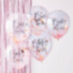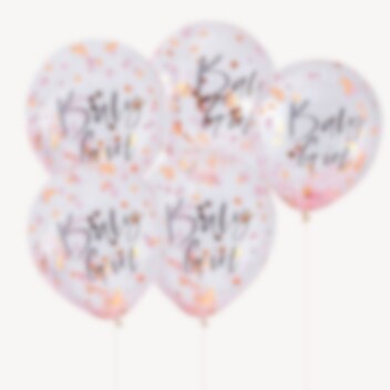 5 balloner med teksten "Baby Girl", der skrevet i rosaguld og lyserødt konfetti indeni. En skøn dekoration til dit Baby shower. Ballonerne bliver ca. 25 cm i diameter når den er oppustet.