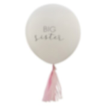Stor hvid ballon med teksten ''Big Sister'' og som har flotte lyserøde kvaster. Ballonen bliver 45 cm i diameter ved oppustning og du får 2 stk. lyserøde kvaster.