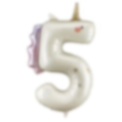 En magisk folieballon formet som tallet 5 med fin enhjørningsdesign. Perfekt til enhjørningskalas eller som del af en større taldekoration.