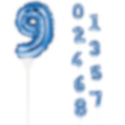 Blå folieballon i et mindre format, til at pynte din kage, dit bagværk eller som en anden sjov dekoration til festen. Ballonen er ca. 13 cm høj og sidder fast op en plastik pind. Ballonen puster sig selv op. Ballonen findes i tallene 0-9 og kan kombineres som du lyster. Prisen er for en ballon. Læs instruktionerne på pakken.