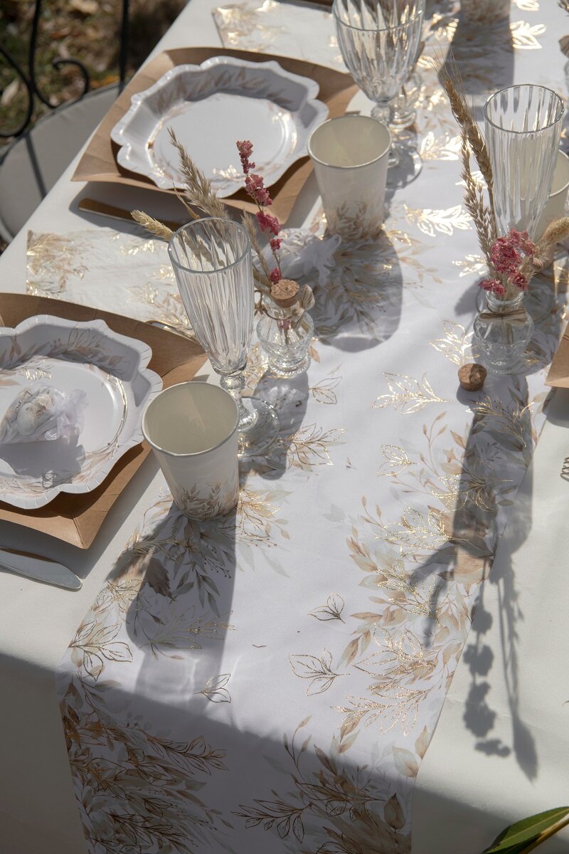 Smuk bordløber med sofistikerede motiver af neutrale blade og guldfolierede detaljer i relief. Dæk bordet smukt med denne til en finere begivenhed eller fest.