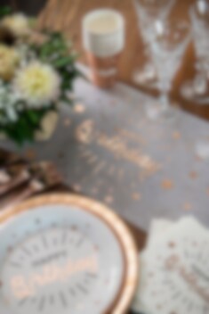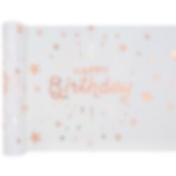 En smuk hvid bordløber med et flot motiv af "Happy Birthday" og stjerner i rosa guldfolie, der vil være den perfekte dekoration til enhver fest eller fest. Bordløberen er lavet af polyester og er ca. 30 cm bred og 5 meter lang.