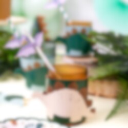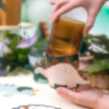 Kreative DIY krusovertræk med dinosaurtema. Hver pakke indeholder seks justerbare overtræk af pap. De er perfekte til at dekorere krus eller drikkeglas og gøre hver drik til en del af børnefødselsdagens tema. Størrelse: 29,5 x 10 cm.