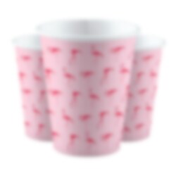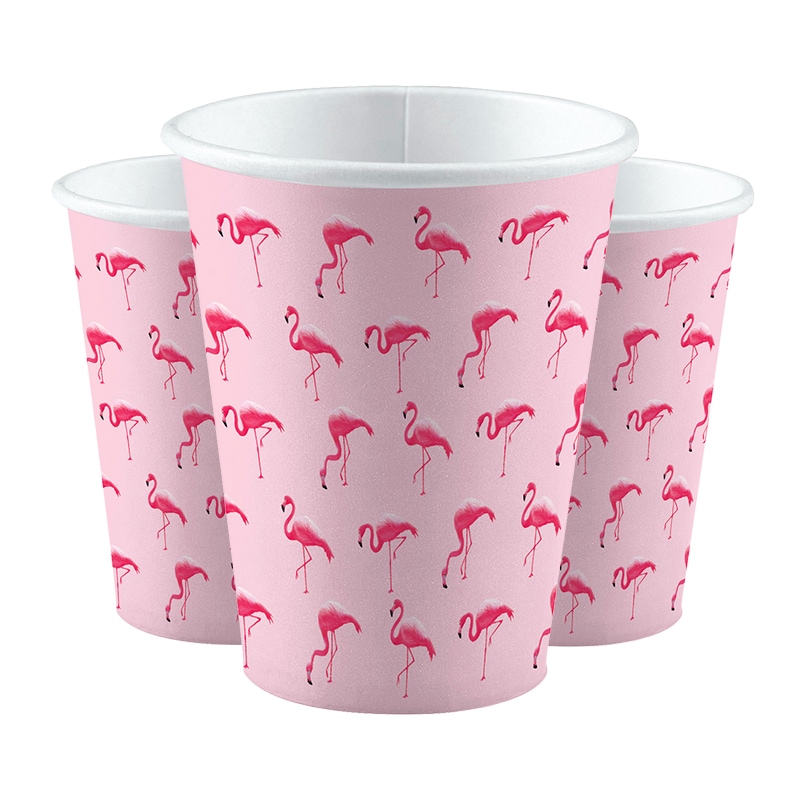 8 stk. lyserøde papkrus med motiv af flamingoer. Krusene er ca. 10 cm høje og kan indeholde ca. 250 ml.