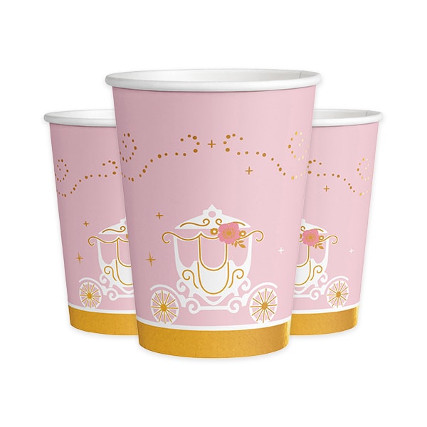 8 stk. papkrus med motiver af prinsessevogne med guldfolieret detaljer på en lyserød baggrund, fra temaet Princess for a Day. Krusene er ca. 9 cm høje og indeholder ca. 250 ml.