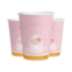 8 stk. papkrus med motiver af prinsessevogne med guldfolieret detaljer på en lyserød baggrund, fra temaet Princess for a Day. Krusene er ca. 9 cm høje og indeholder ca. 250 ml.