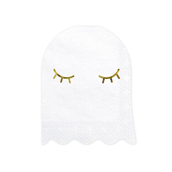 20 stk. hvide servietter formede som et spøgelse med guldfolierede øjne. Perfekte at have på bordet til din Halloweenfest. Servietterne er 2-lags og er ca. 22,5 x 28 cm store når udfoldede.