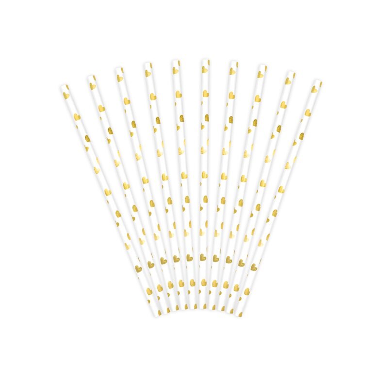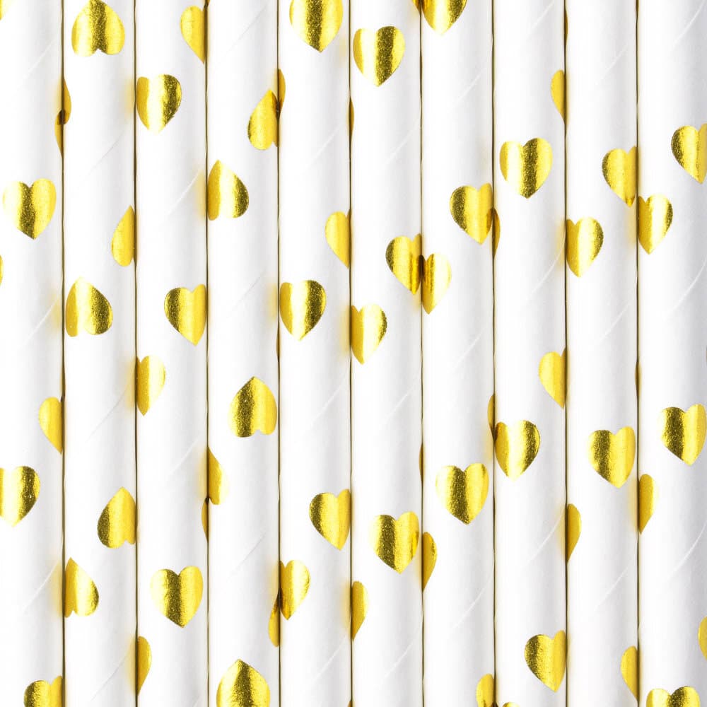 10 flotte sugerør i hvidt papir med motiver af søde gyldne hjerter. Super flot til at dække bordet til dit baby shower, baby shower eller anden festlig begivenhed.