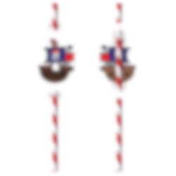 8 rød- og hvidstribede sugerør af pap med pirat-motiver. En sjov lille detalje at tilføje til borddækningen til en fest med pirattema. Måler ca. 19 cm.