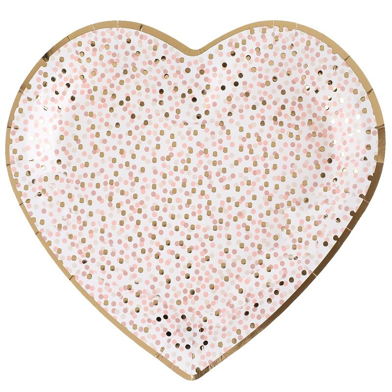 10 stk. hjerteformede tallerkner med lyserøde og guldfolierede prikker og guldfolierede kanter. Supersøde at dække op til en babyshower eller en dåb. Tallerknerne er cirka 22,5 x 20 cm store.